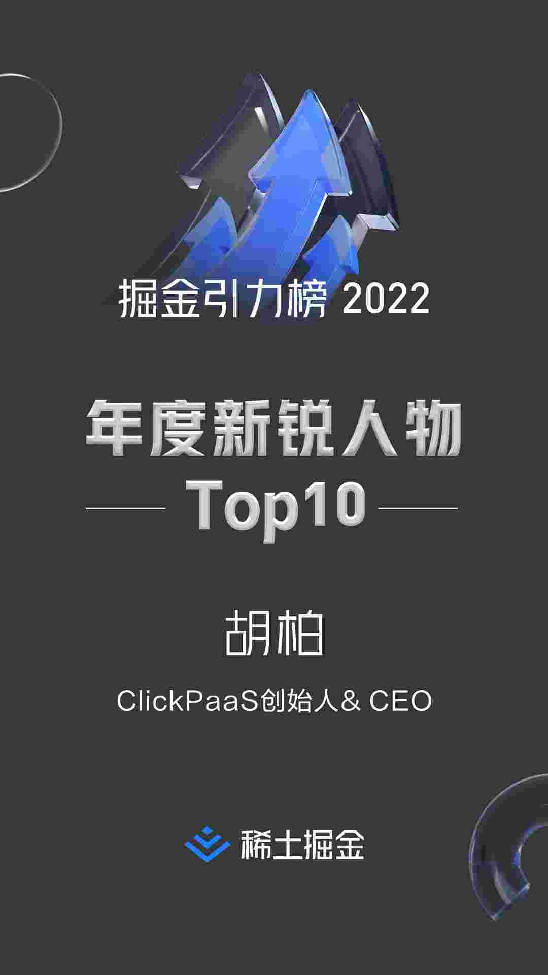 2022年1月6日,,,,,,,稀土掘金社区第一届「掘金未来大会」成功举办,,,,,会上发布了“2022 稀土掘金引力榜 年度新锐人物”榜单,,,,,,,,,,,上海爱湃斯科技有限公司(简称华为钱包)创始人及CEO胡柏实力入选年度新锐人物TOP 10。。。。。。